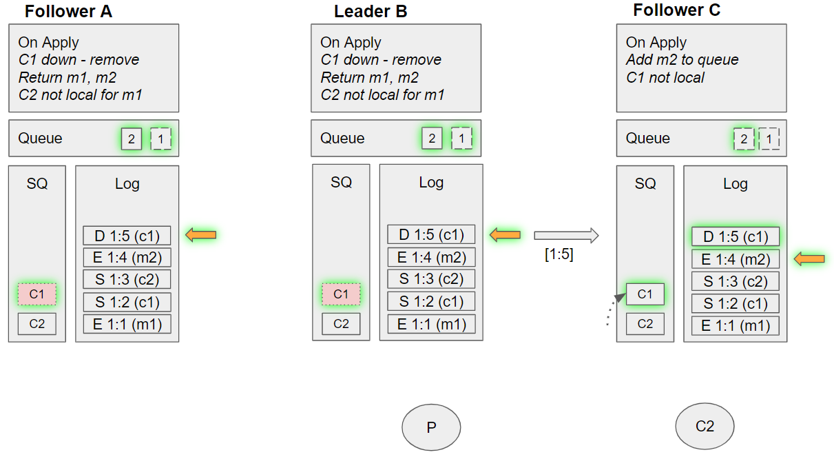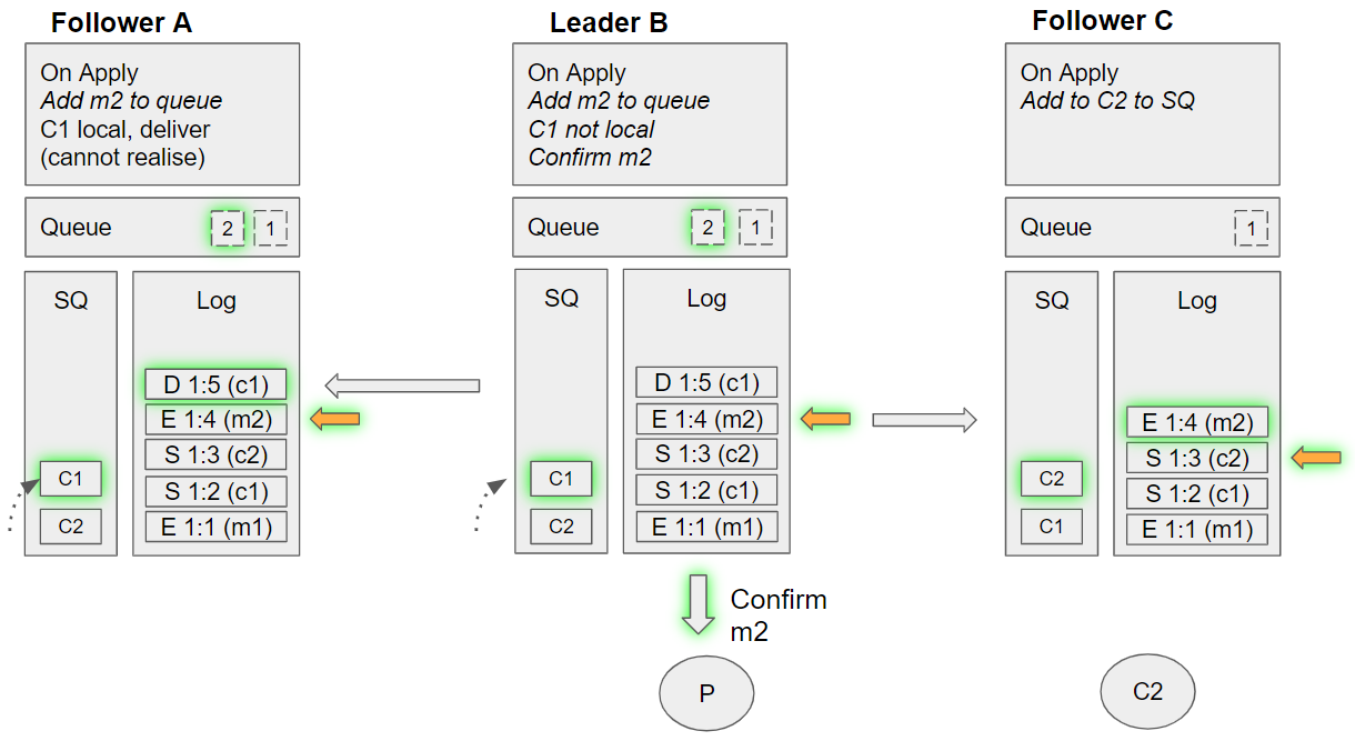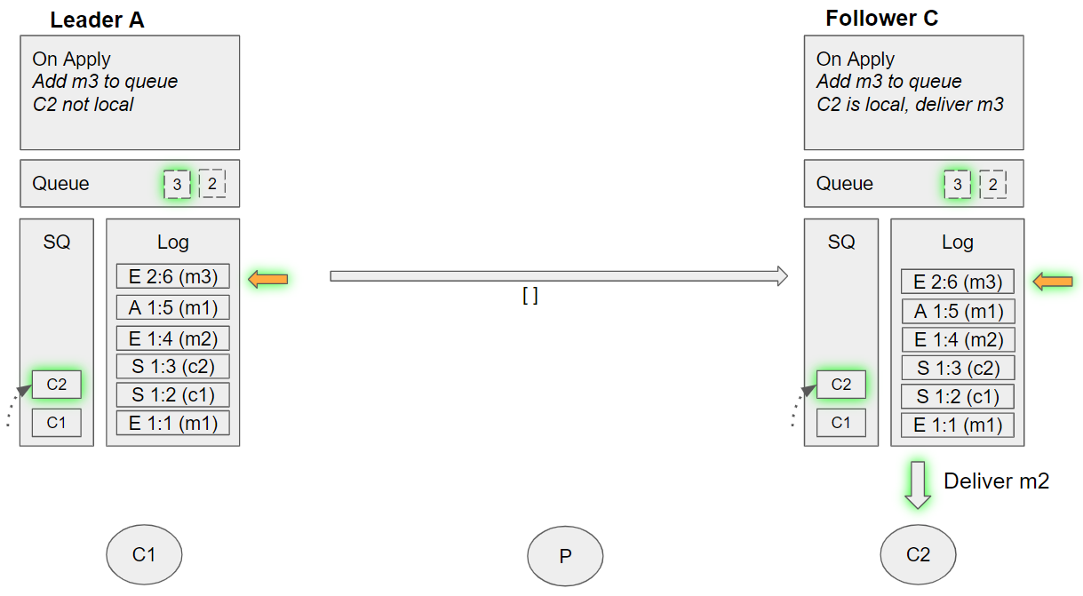 2. Follower C takes the next undelivered message, m1. Dequeues C2 from its SQ, and sees that C2 is local. Sends m1 to this local channel, requeues C2 on the SQ.