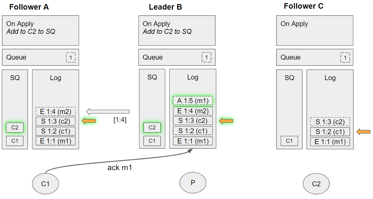1. Removes the message from its queue *Follower C applies the enqueue m2 command: